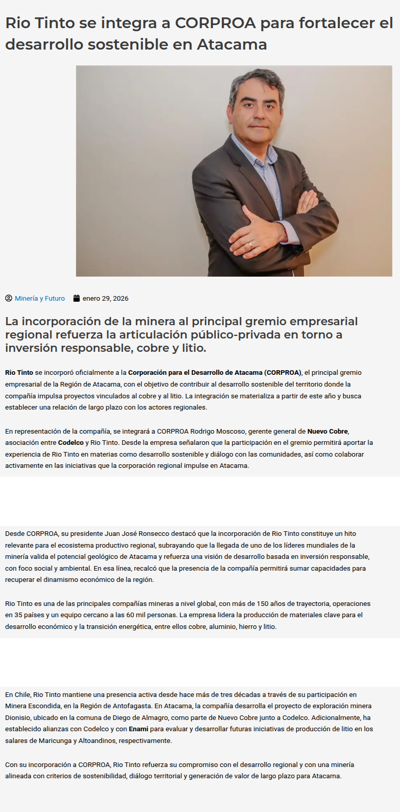 Minera Rio Tinto se integra a CORPROA para contribuir al desarrollo sostenible de la Región de Atacama - (elreporterodeiquique)
