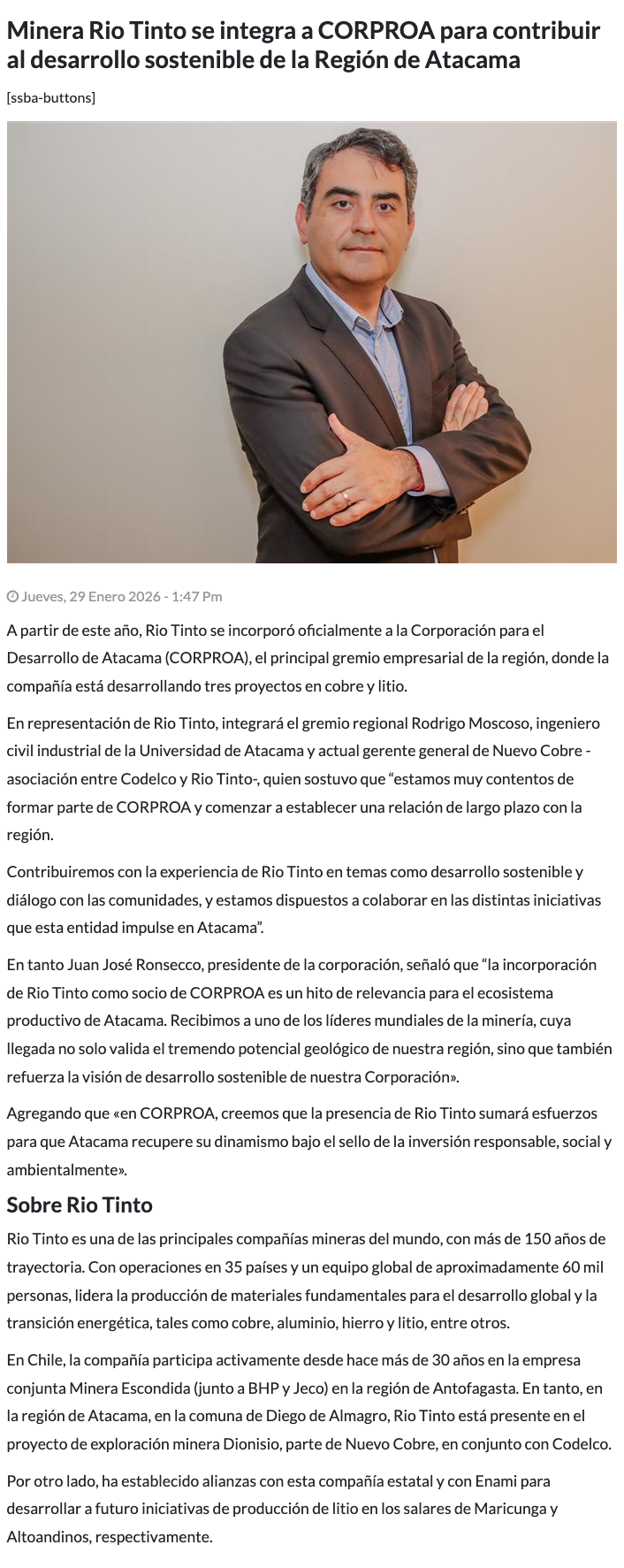 Minera Rio Tinto se integra a CORPROA para contribuir al desarrollo sostenible de la Región de Atacama - (elreporterodeiquique)