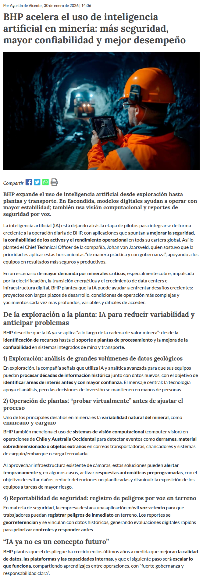 BHP acelera el uso de inteligencia artificial en minería: más seguridad, mayor confiabilidad y mejor desempeño - (reporteminero)