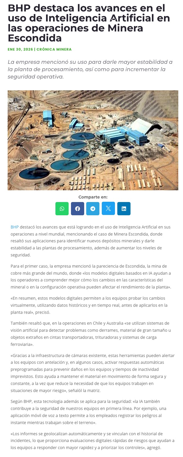 BHP acelera el uso de inteligencia artificial en minería: más seguridad, mayor confiabilidad y mejor desempeño - (reporteminero)