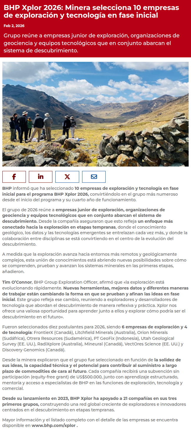 BHP escoge a 10 empresas de exploración y tecnología minera para su programa Xplor 2026 - (electromineria.cl)
