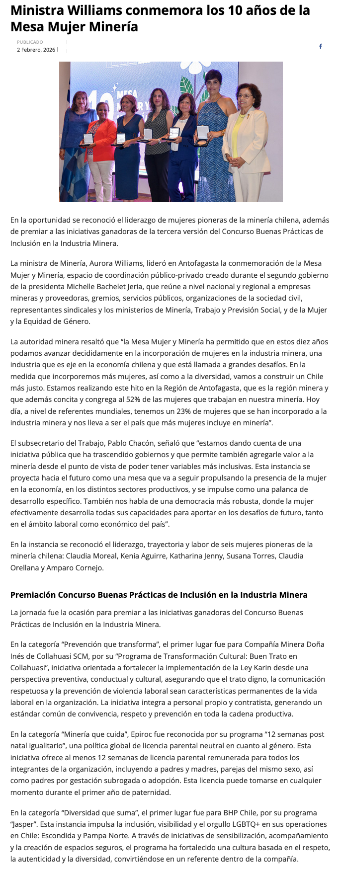 Conmemoran 10 años de la Mesa Mujer y Minería y premia inclusión en Antofagasta - (El Chañarcillo)