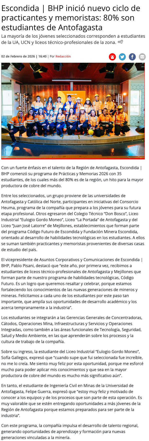 Escondida BHP inició nuevo ciclo de practicantes y memoristas: 80% son estudiantes de la región - (timeline)