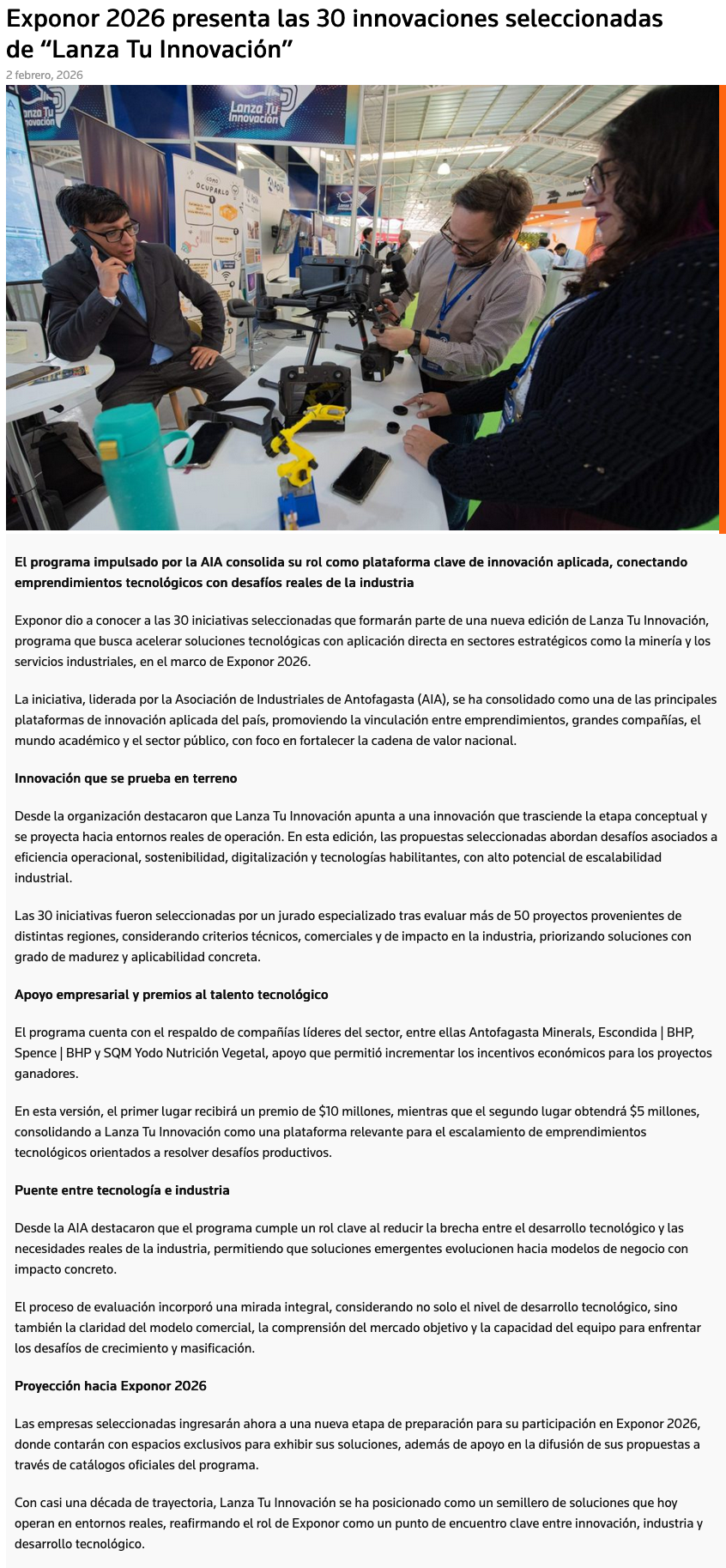 EXPONOR 2026: Conozca las 30 innovaciones que formarán parte de “Lanza tu Innovación 2026” - (guiaminera.cl)
