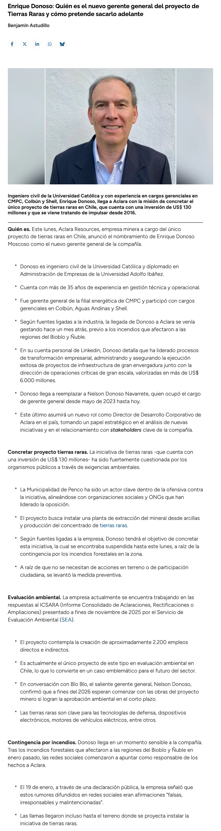 Aclara Resources mueve piezas y cambia a su gerente general en Chile - (Diario Financiero)