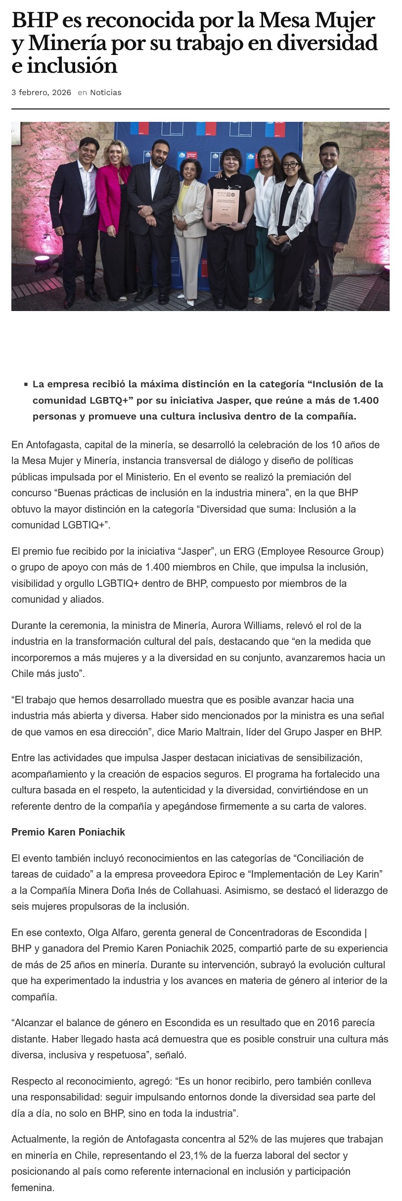 BHP es reconocida por la Mesa Mujer y Minería por su trabajo en diversidad e inclusión - (minerialocal.cl)