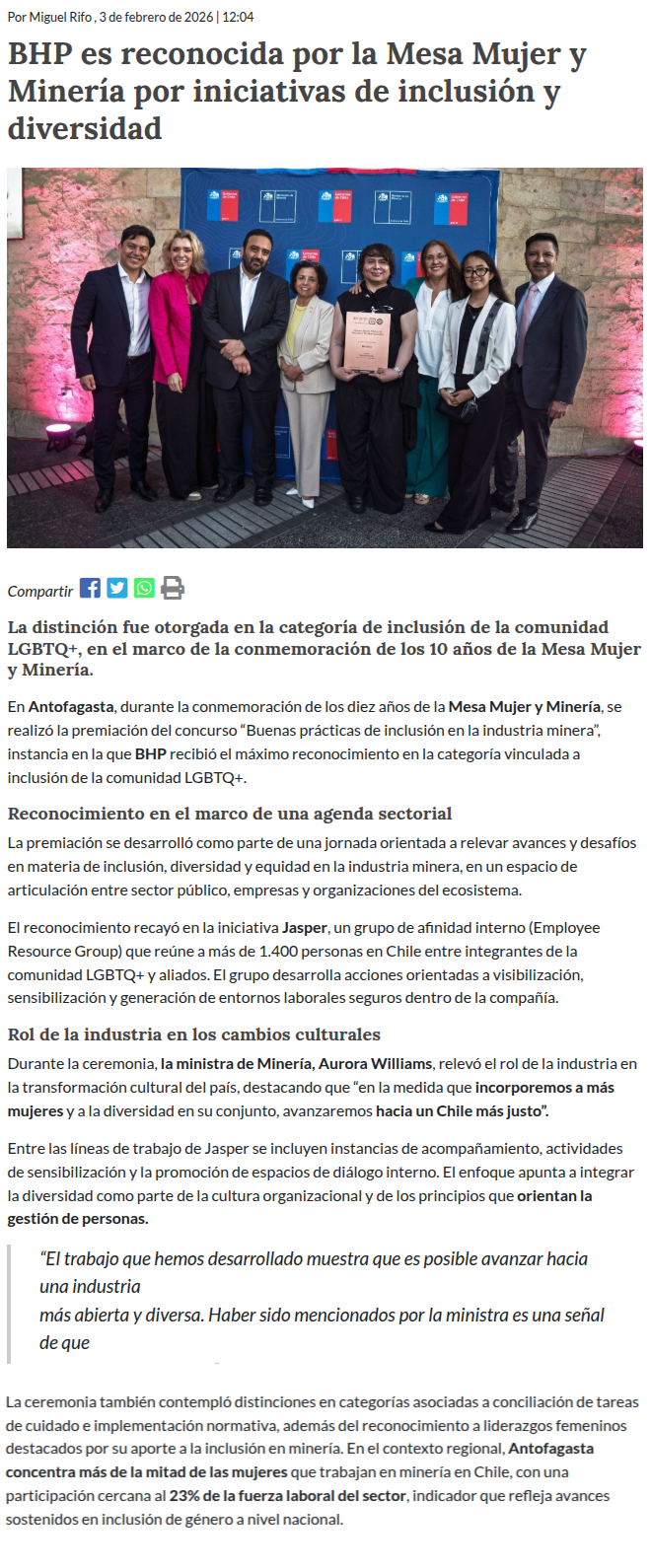 BHP es reconocida por la Mesa Mujer y Minería por su trabajo en diversidad e inclusión - (minerialocal.cl)