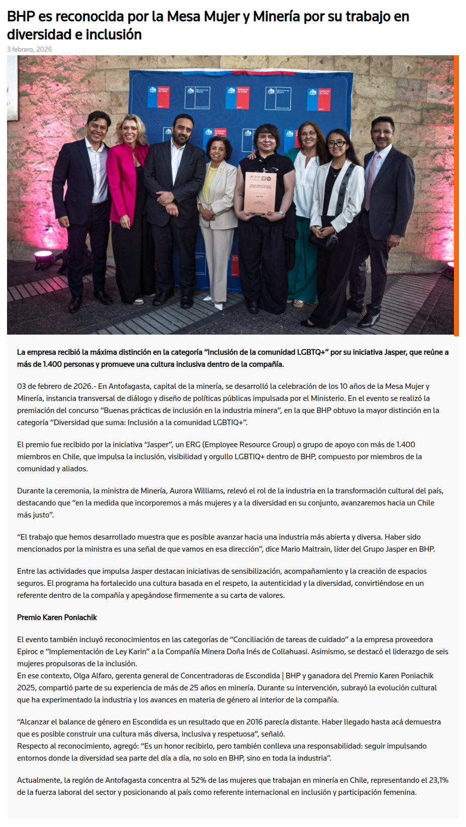 BHP es reconocida por la Mesa Mujer y Minería por su trabajo en diversidad e inclusión - (minerialocal.cl)