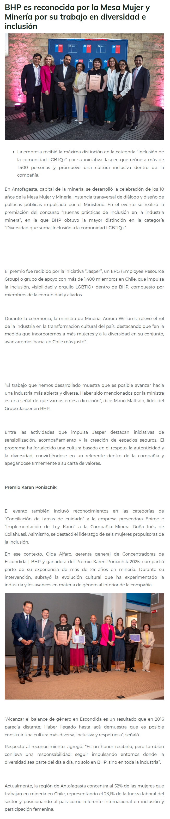 BHP es reconocida por la Mesa Mujer y Minería por su trabajo en diversidad e inclusión - (elreporterodeiquique)