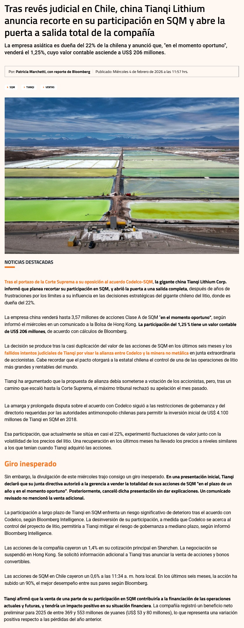 ¿El 1,25% o todo?: la interrogante que se abre con el anuncio de Tianqi de vender parte de sus acciones en SQM - (Pulso)