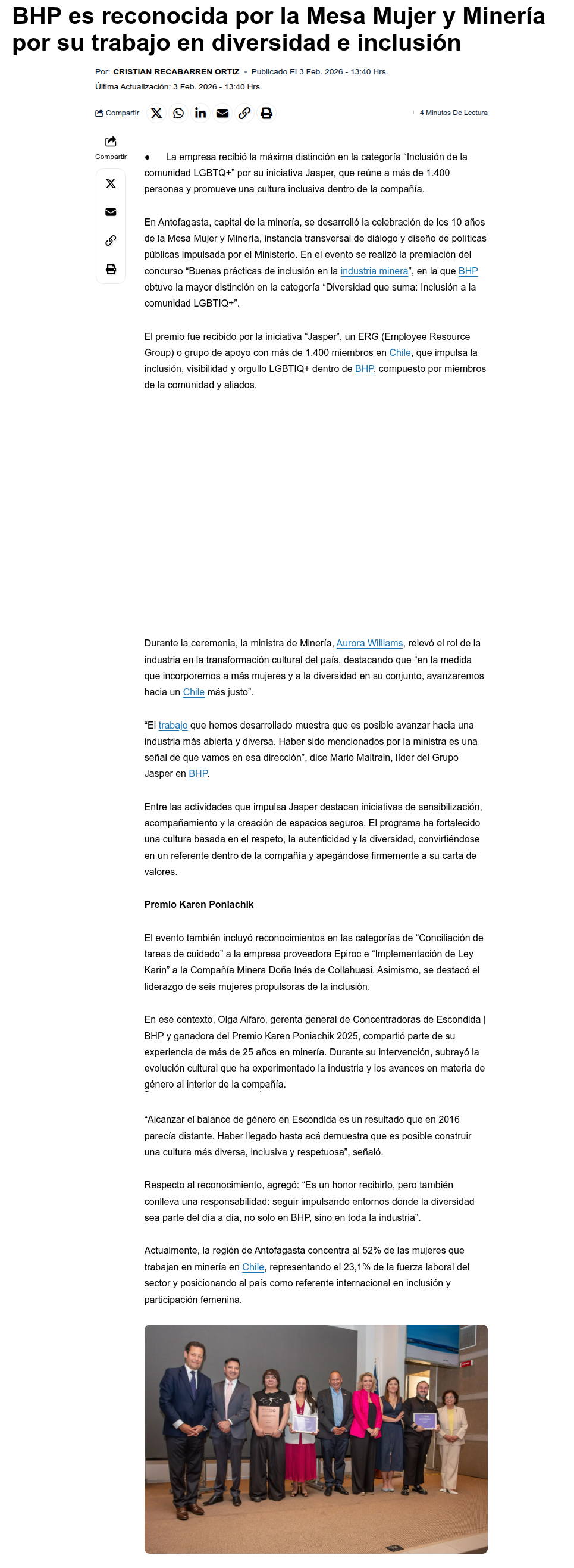 BHP es reconocida por la Mesa Mujer y Minería por su trabajo en diversidad e inclusión - (portalminero)