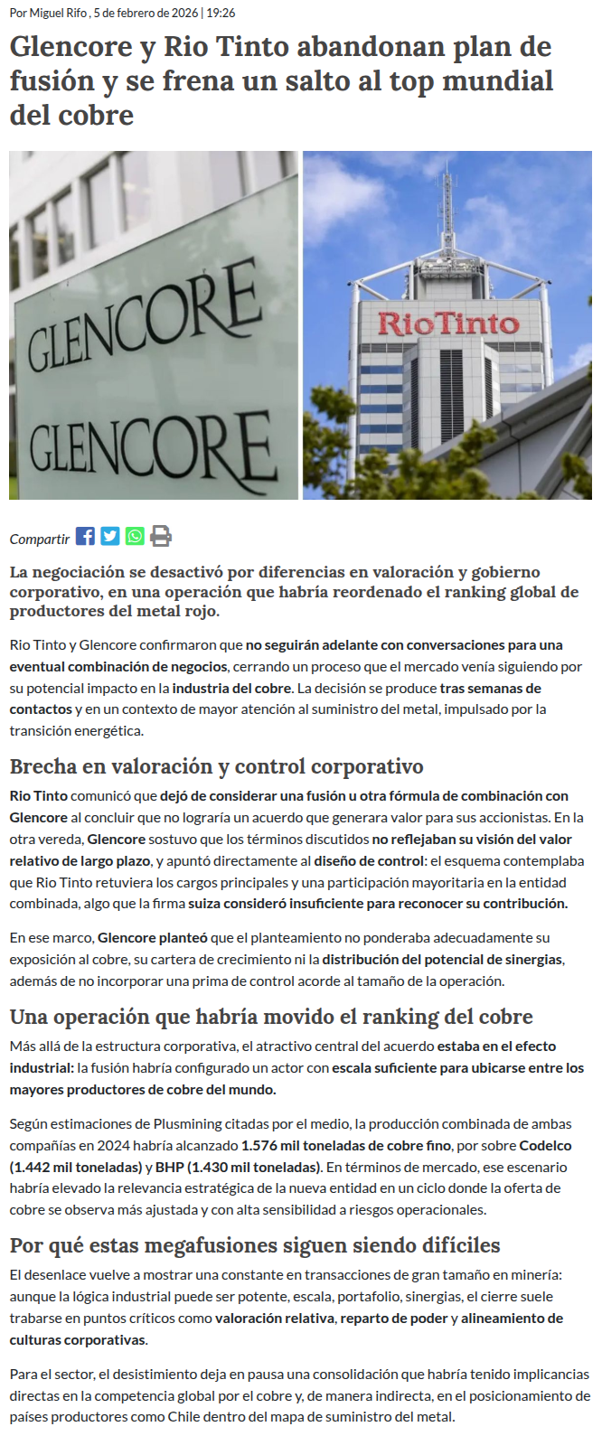 Rio Tinto y Glencore desisten de fusión que los ubicaba en el top mundial del cobre - (La Tercera Online)