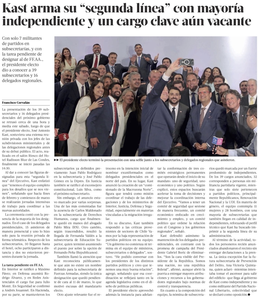 Figuras independientes y de Chile Vamos predominan en subsecretarías del gobierno de Kast - (El Mercurio de Santiago)