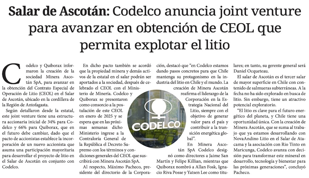Codelco y Quiborax crean Minera Ascotán para explotar litio - (La Segunda)