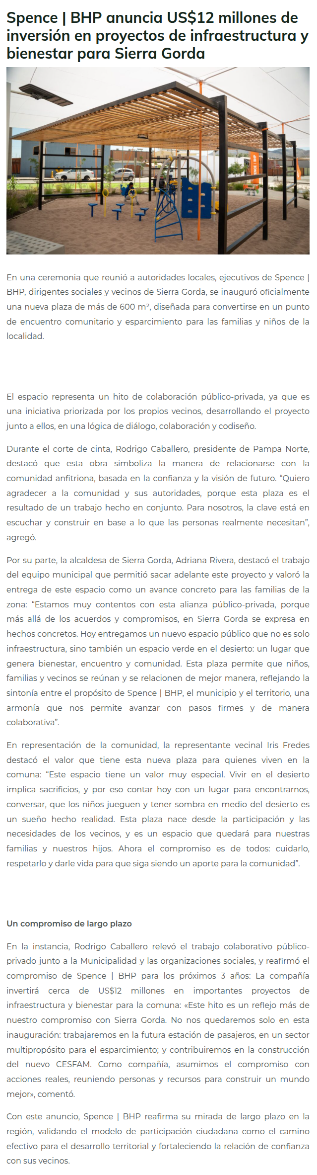 Spence | BHP anuncia US$12 millones de inversión en proyectos de infraestructura y bienestar para Sierra Gorda - (trendconomy.cl)