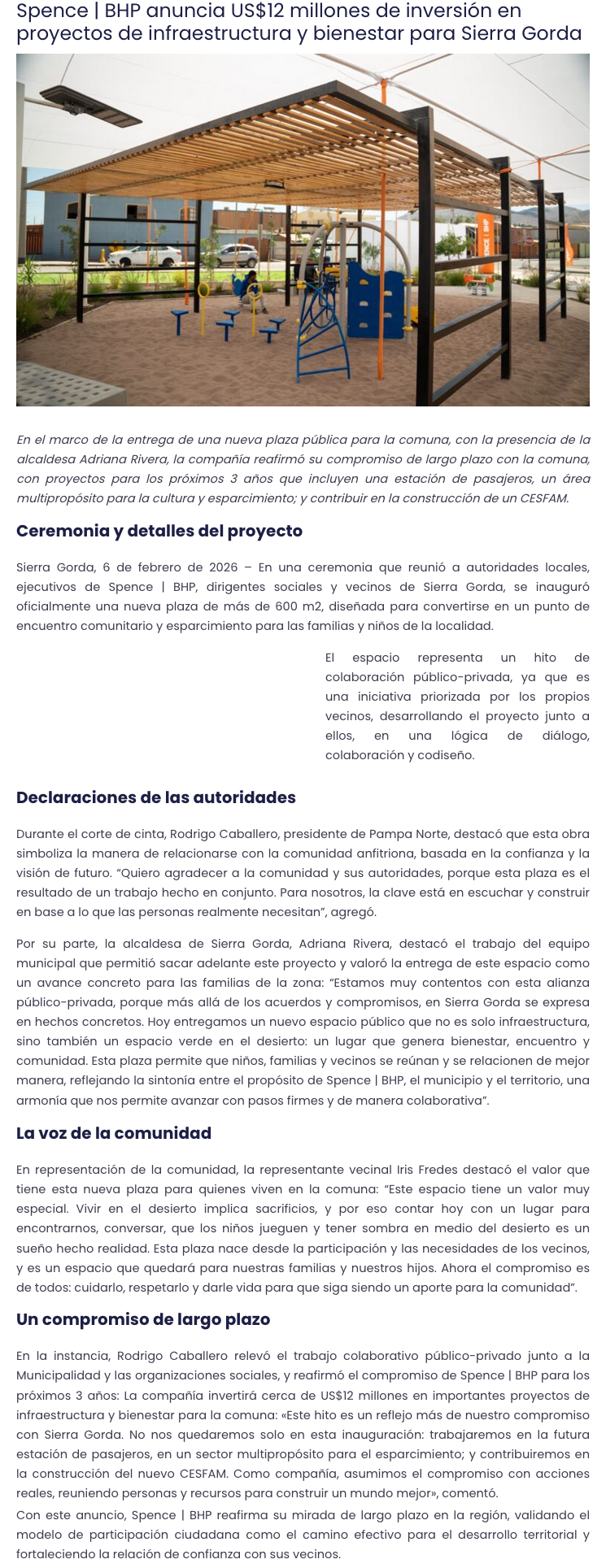 Spence | BHP anuncia US$12 millones de inversión en proyectos de infraestructura y bienestar para Sierra Gorda - (minerialocal.cl)