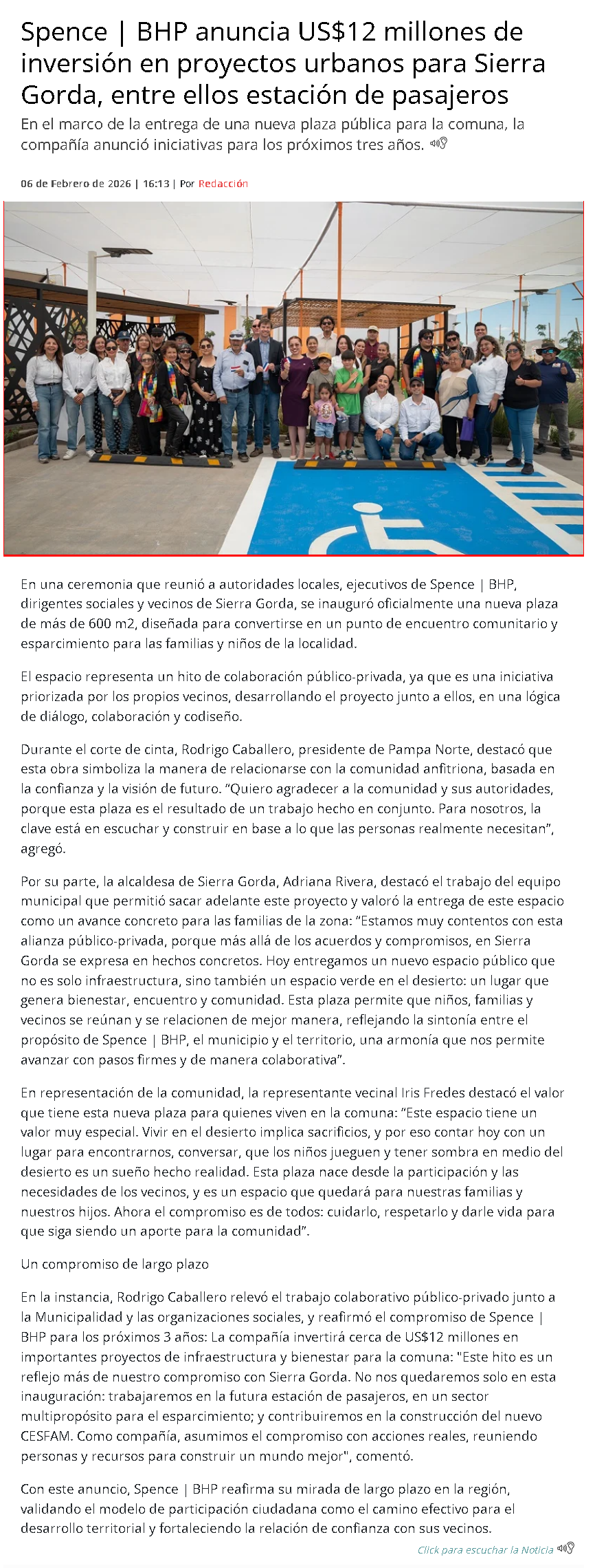 Spence | BHP anuncia US$12 millones de inversión en proyectos de infraestructura y bienestar para Sierra Gorda - (basenacional.cl)