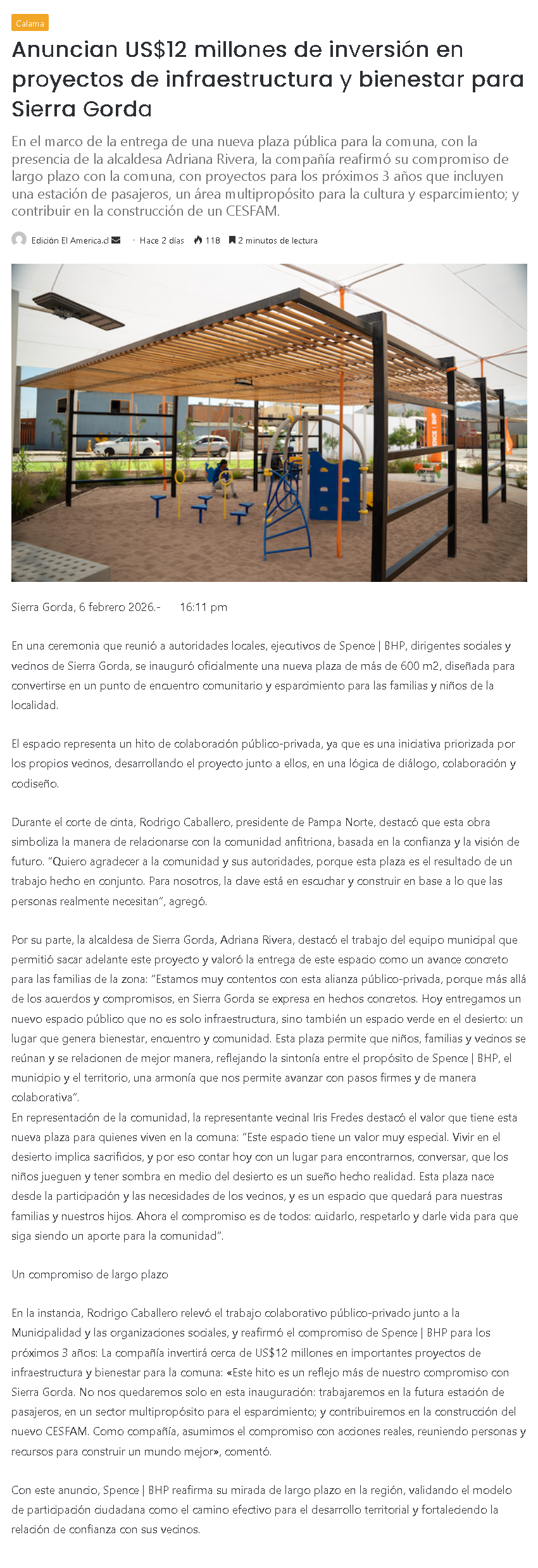 Spence | BHP anuncia US$12 millones de inversión en proyectos de infraestructura y bienestar para Sierra Gorda - (trendconomy.cl)