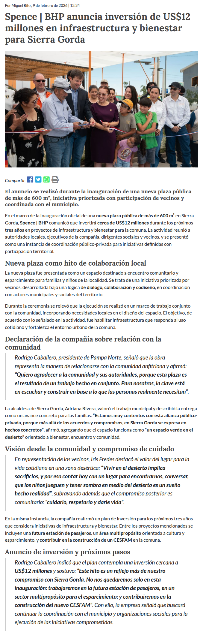 Spence BHP anuncia US$12 millones de inversión en proyectos de infraestructura y bienestar para Sierra Gorda - (timeline)