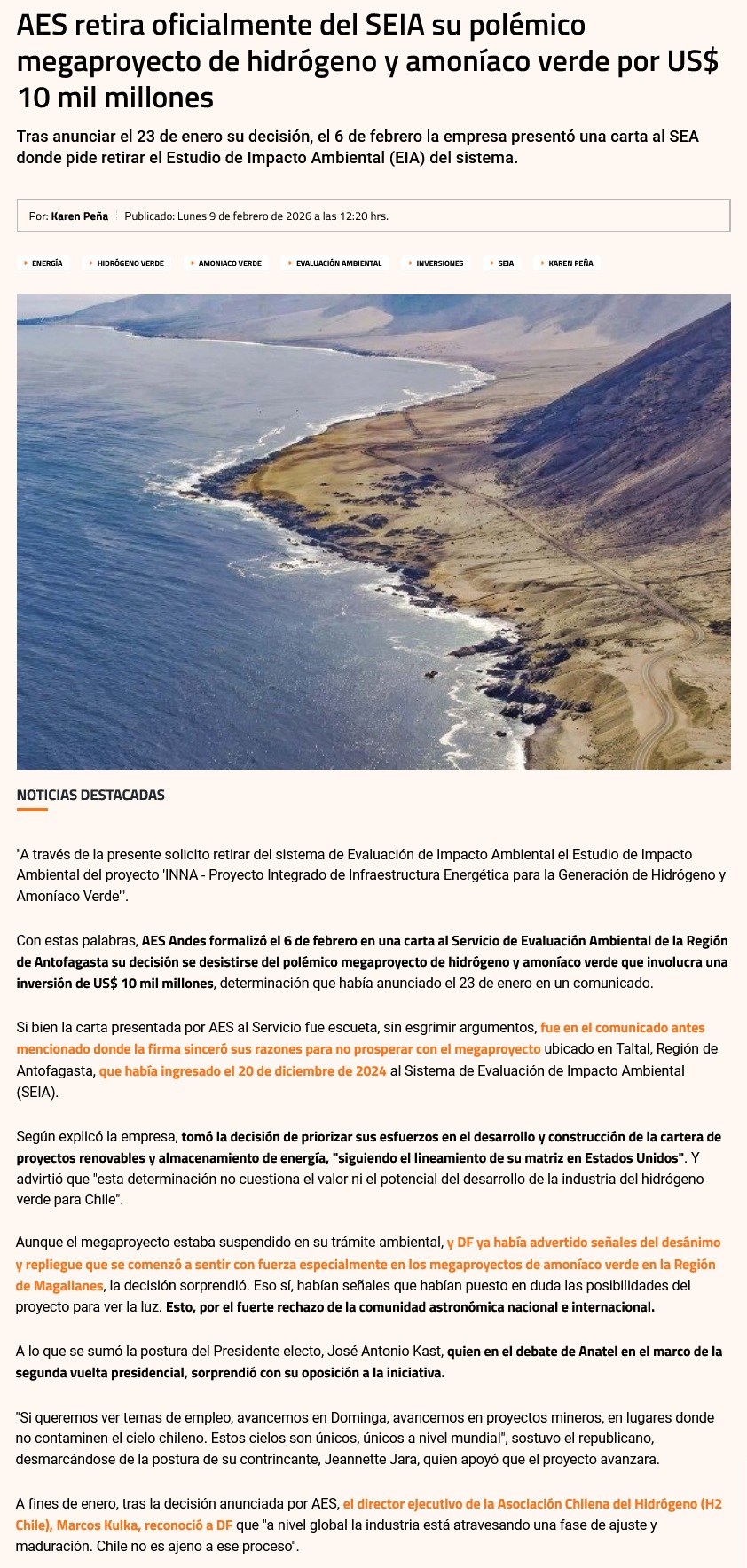 La decisión de AES Andes sobre INNA: por qué se terminó cayendo el proyecto de hidrógeno verde, según la industria - (La Tercera Online)