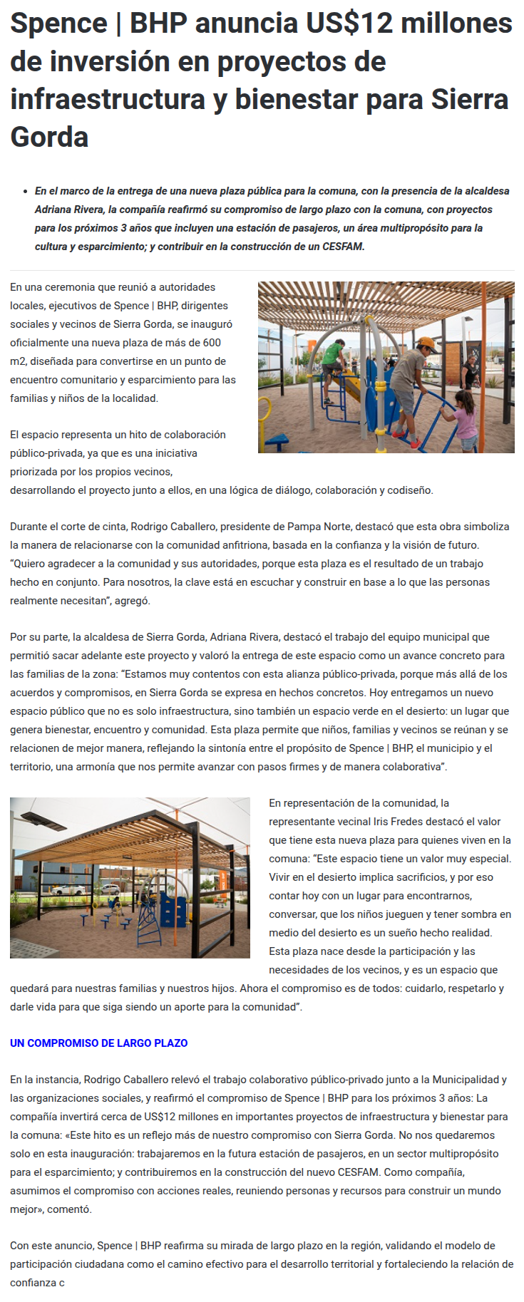 Spence BHP anuncia US$12 millones de inversión en proyectos de infraestructura y bienestar para Sierra Gorda - (timeline)