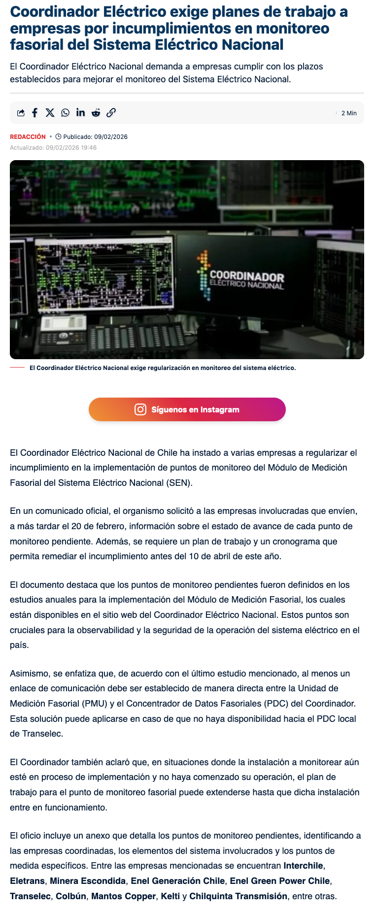 Coordinador Eléctrico solicita planes de trabajo por incumplimientos en puntos de monitoreo fasorial del SEN - (electromineria.cl)