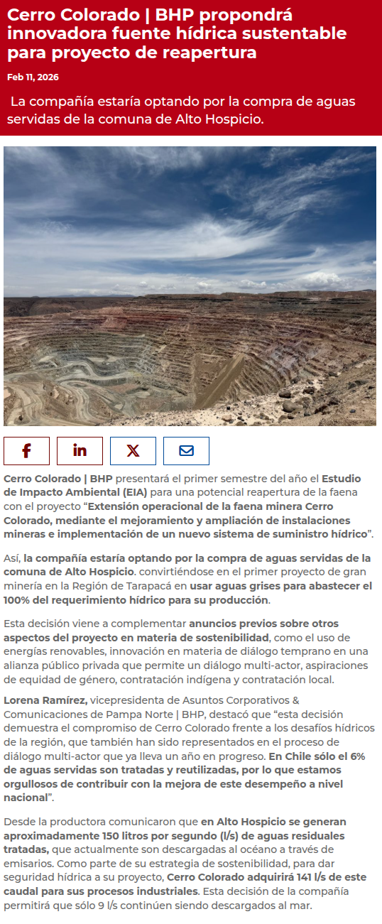 Cerro Colorado | BHP propondrá innovadora fuente hídrica sustentable para proyecto de reapertura - (minerialocal.cl)
