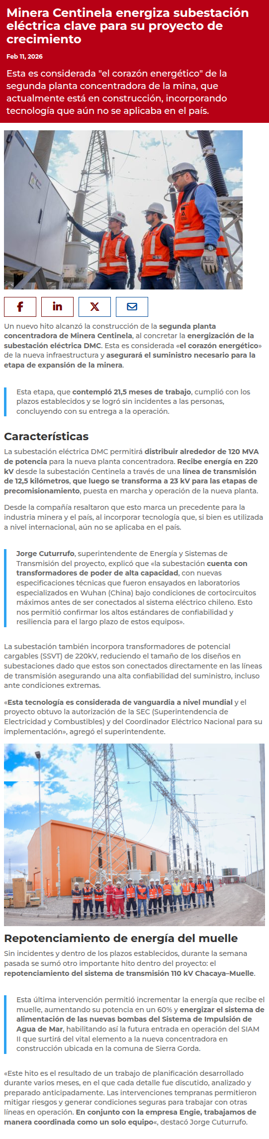 Centinela activa flota autónoma y energización de subestación eléctrica - (El Mercurio de Antofagasta)