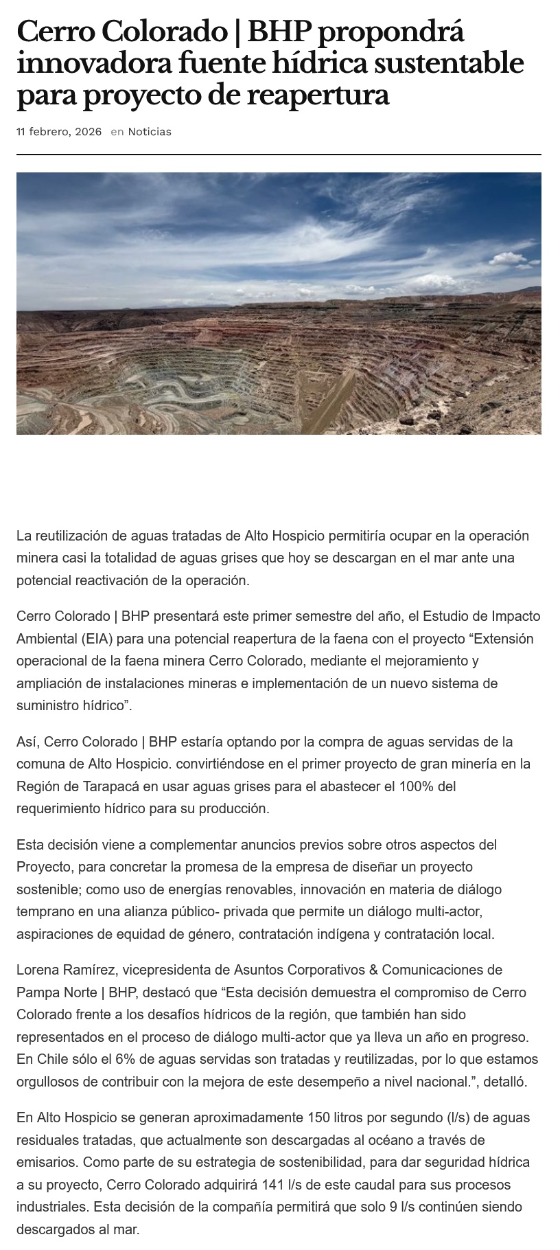 Cerro Colorado | BHP propondrá innovadora fuente hídrica sustentable para proyecto de reapertura - (minerialocal.cl)