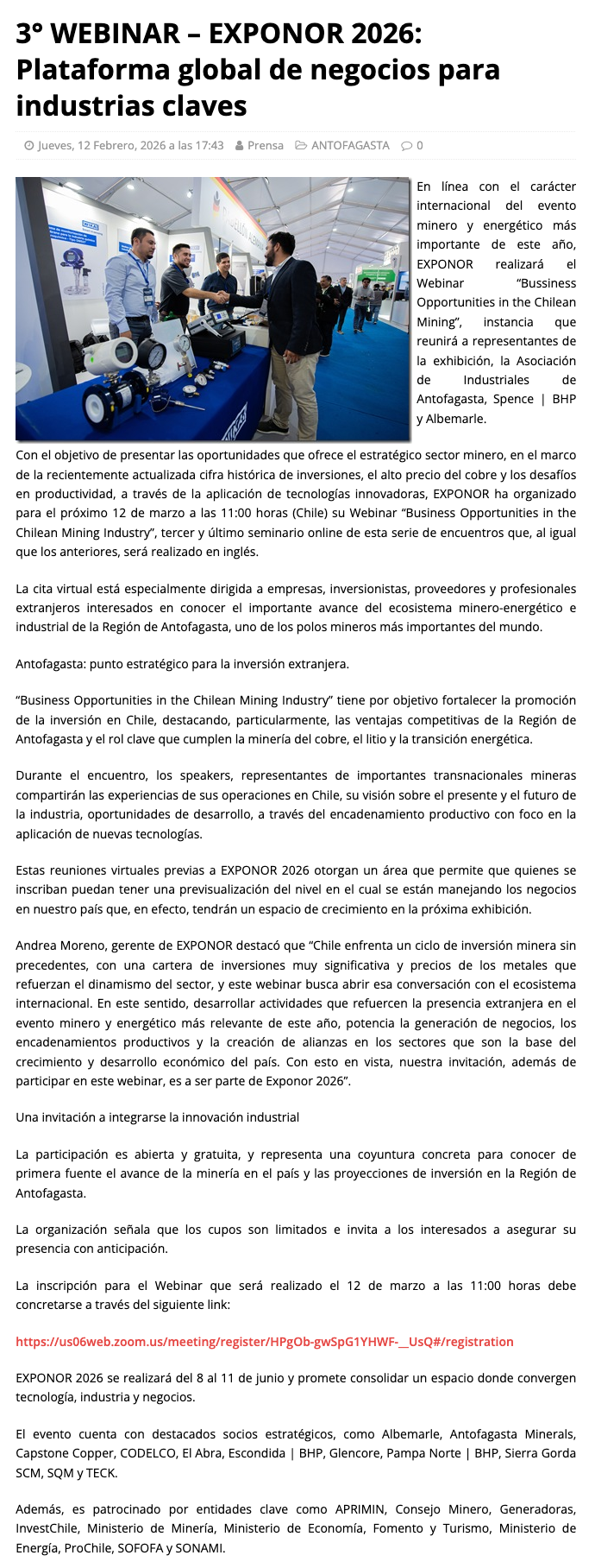 3° WEBINAR – EXPONOR 2026: Plataforma global de negocios para industrias claves - (antofagastanoticias)