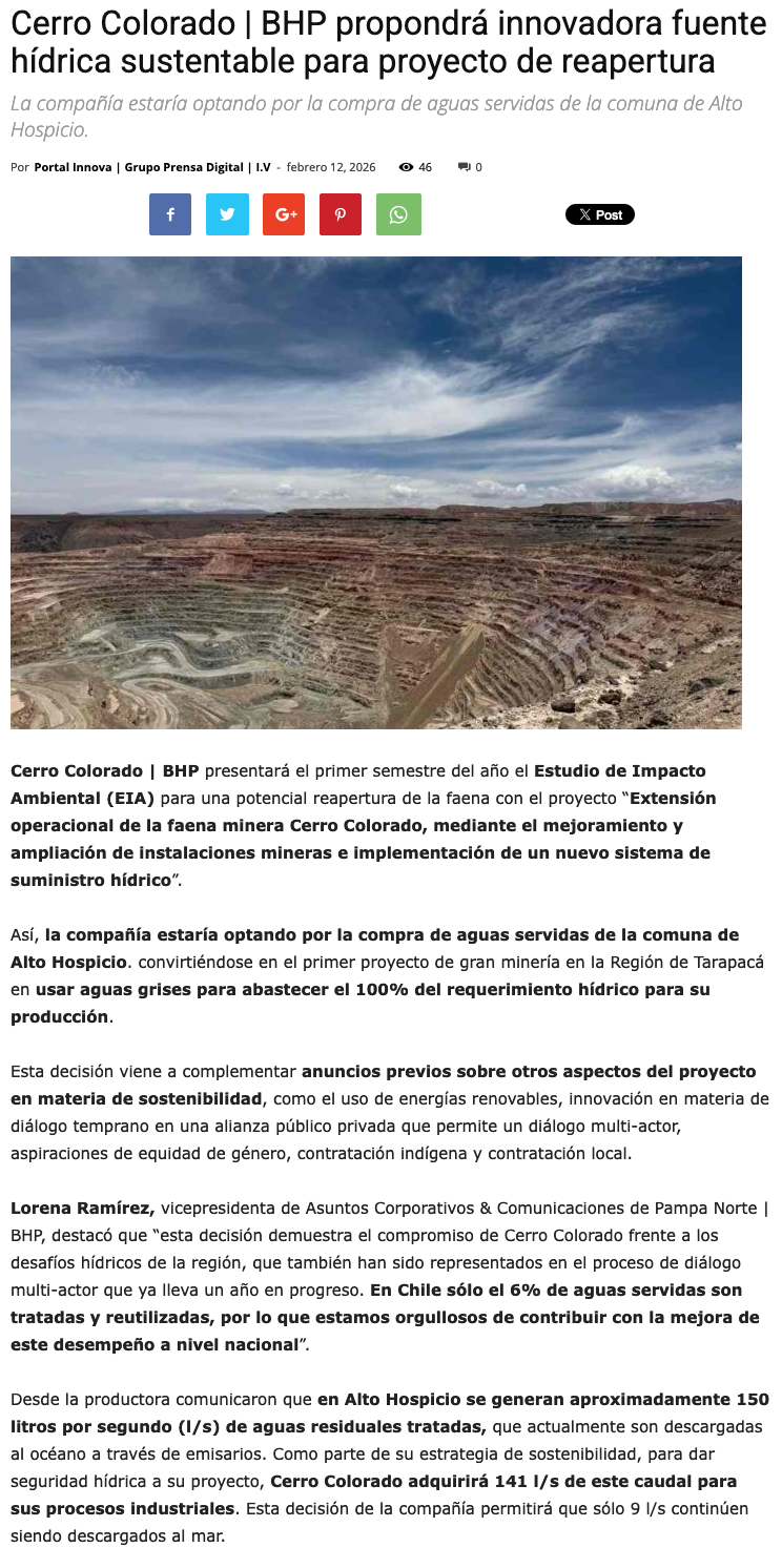 Cerro Colorado | BHP reutilizará 100% de aguas servidas para abastecer sus operaciones - (revistacrisol.cl)