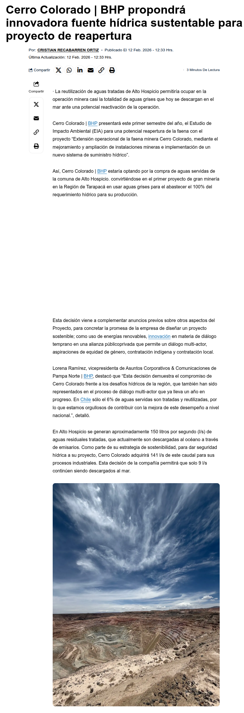 Cerro Colorado | BHP reutilizará 100% de aguas servidas para abastecer sus operaciones - (revistacrisol.cl)