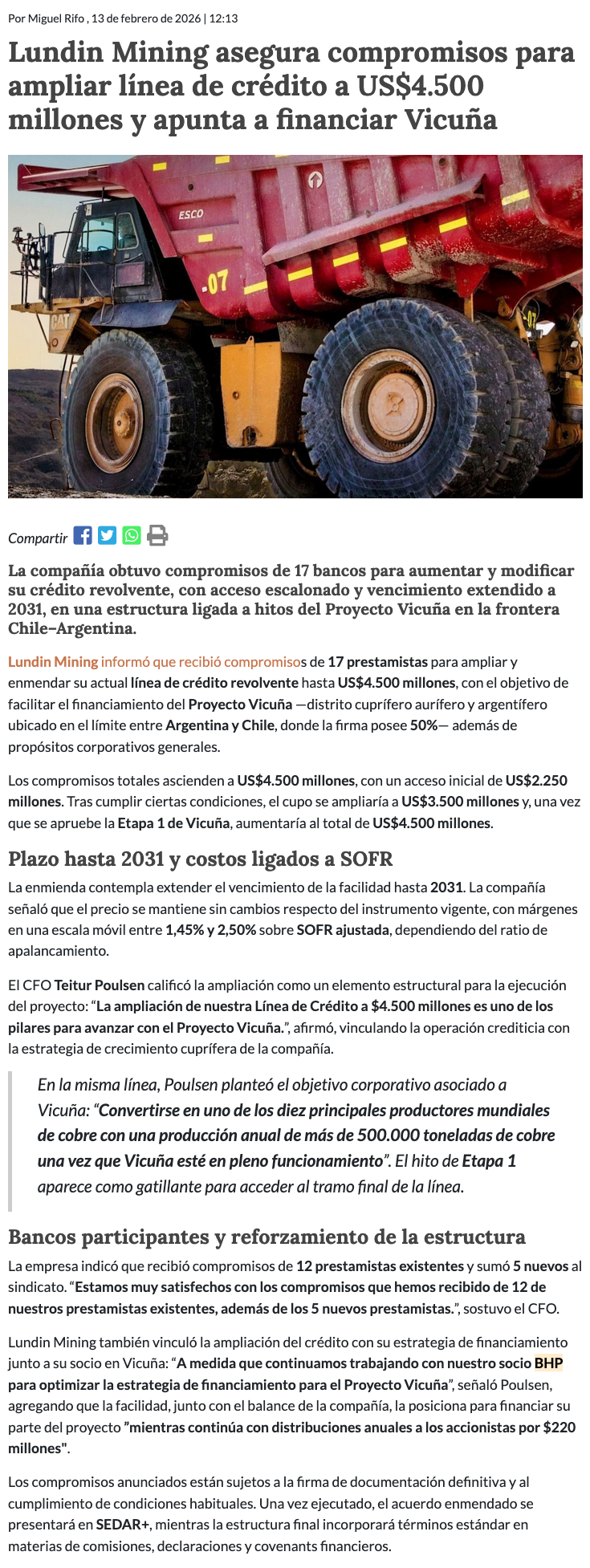 Lundin Mining avanza en mecanismo para financiar proyecto Vicuña - (mch.cl)