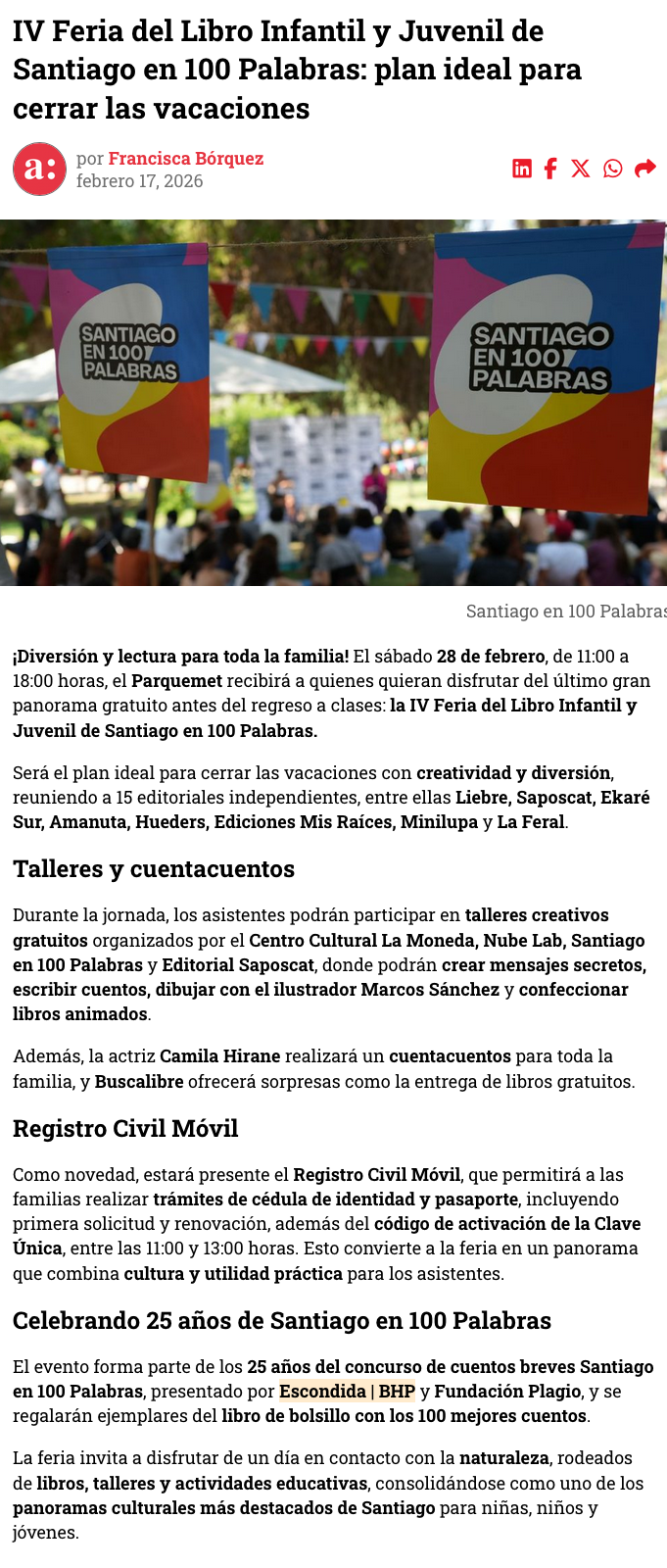 IV Feria del Libro Infantil y Juvenil de Santiago en 100 Palabras: el último gran panorama para despedir las vacaciones en familia - (prensaeventos.cl)