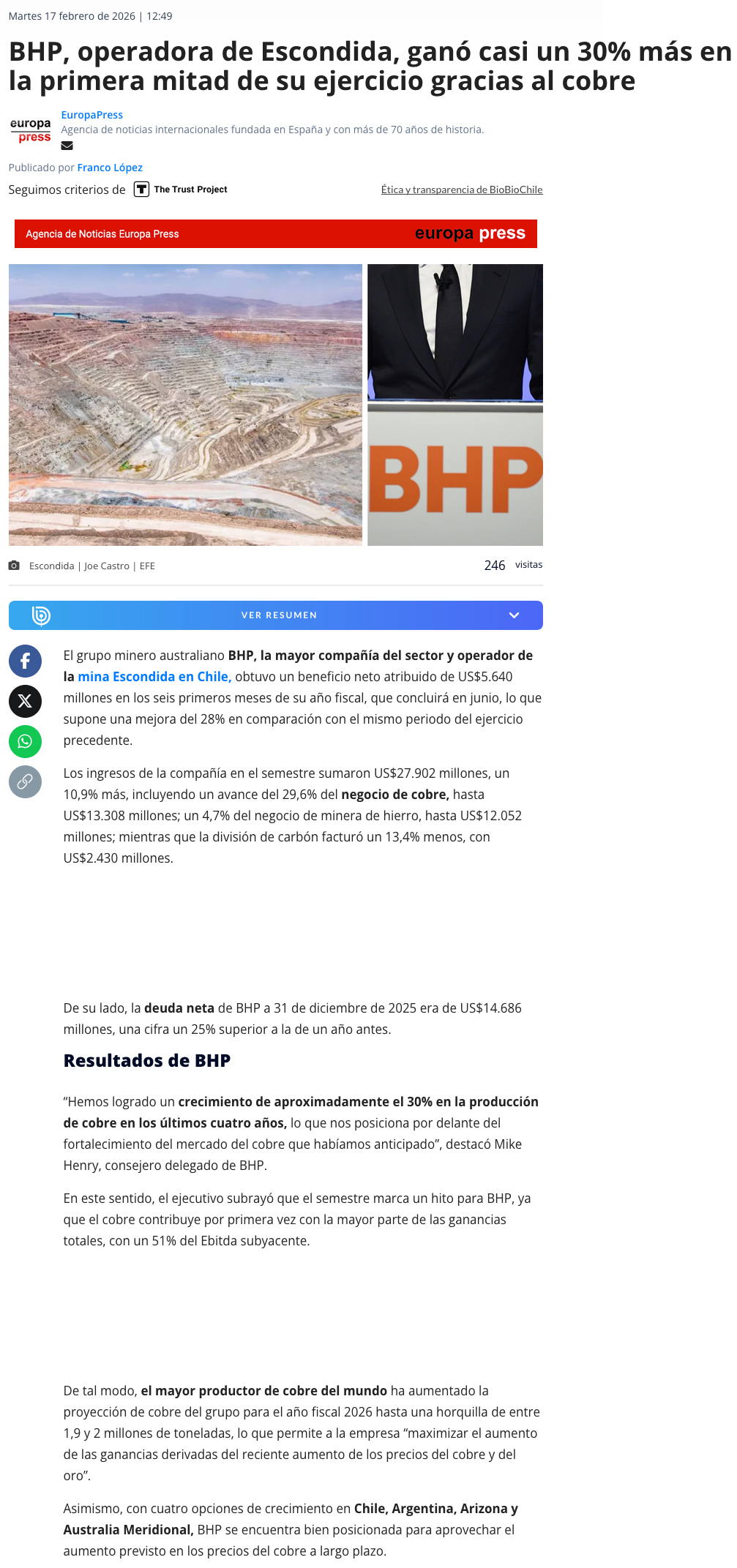 BHP registra ganancias récord y por primera vez el cobre representa más de la mitad - (La Tercera Online)