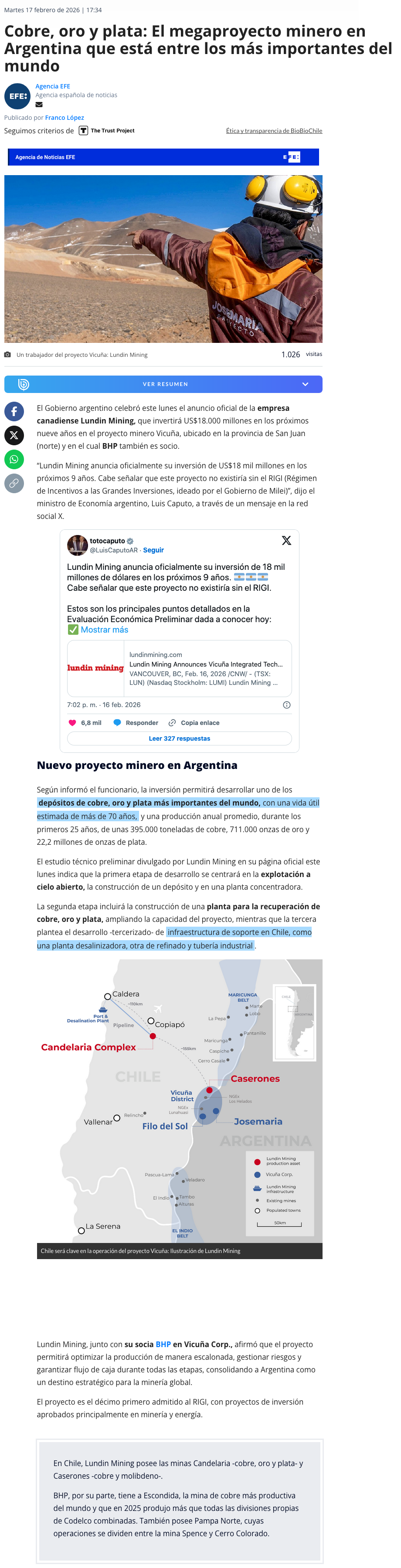 Firma minera conjunta entre BHP y Lundin invertirá US$18 mil millones en Argentina y gobierno de Milei celebra - (emol)