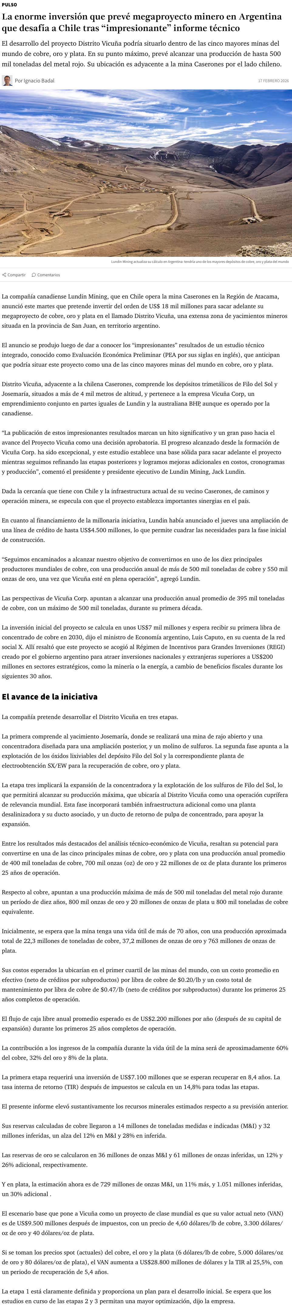 Firma minera conjunta entre BHP y Lundin invertirá US$18 mil millones en Argentina y gobierno de Milei celebra - (emol)
