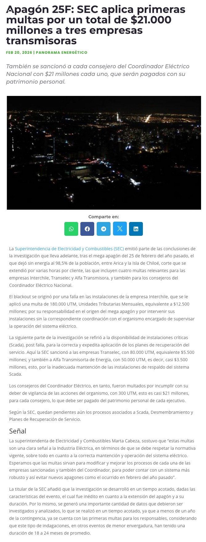 SEC aplica multas por US$ 25 millones a empresas y al Coordinador por responsabilidad en megaapagón - (El Mercurio de Santiago)