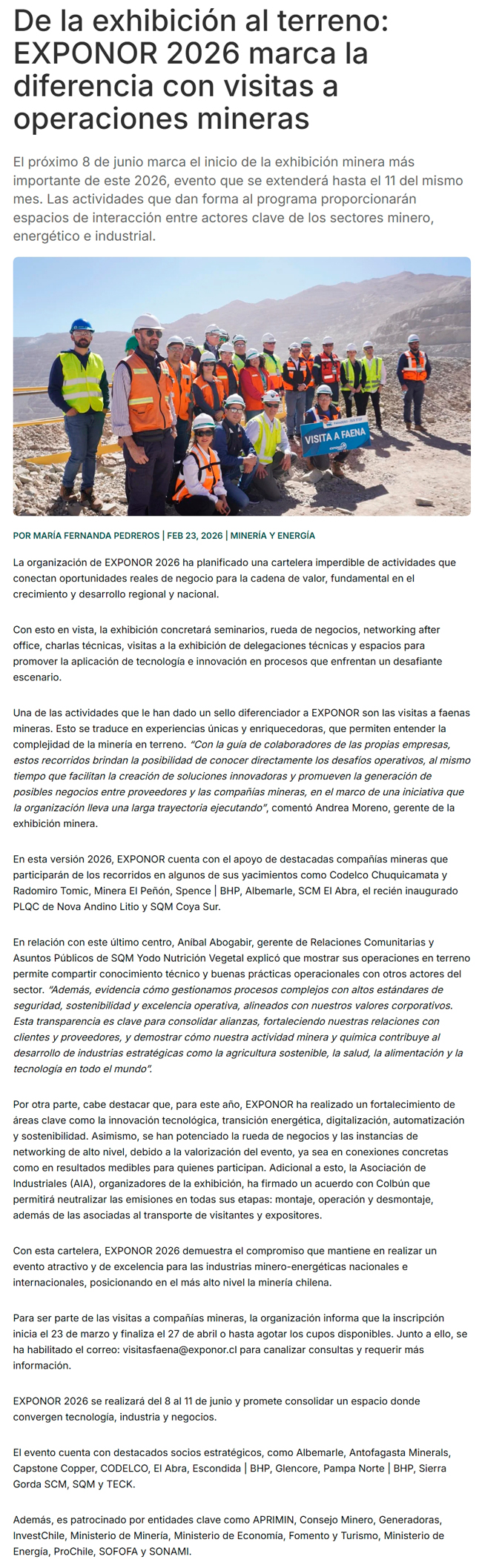 De la exhibición al terreno: EXPONOR 2026 marca la diferencia con visitas a operaciones mineras - (norteyenegia.cl)