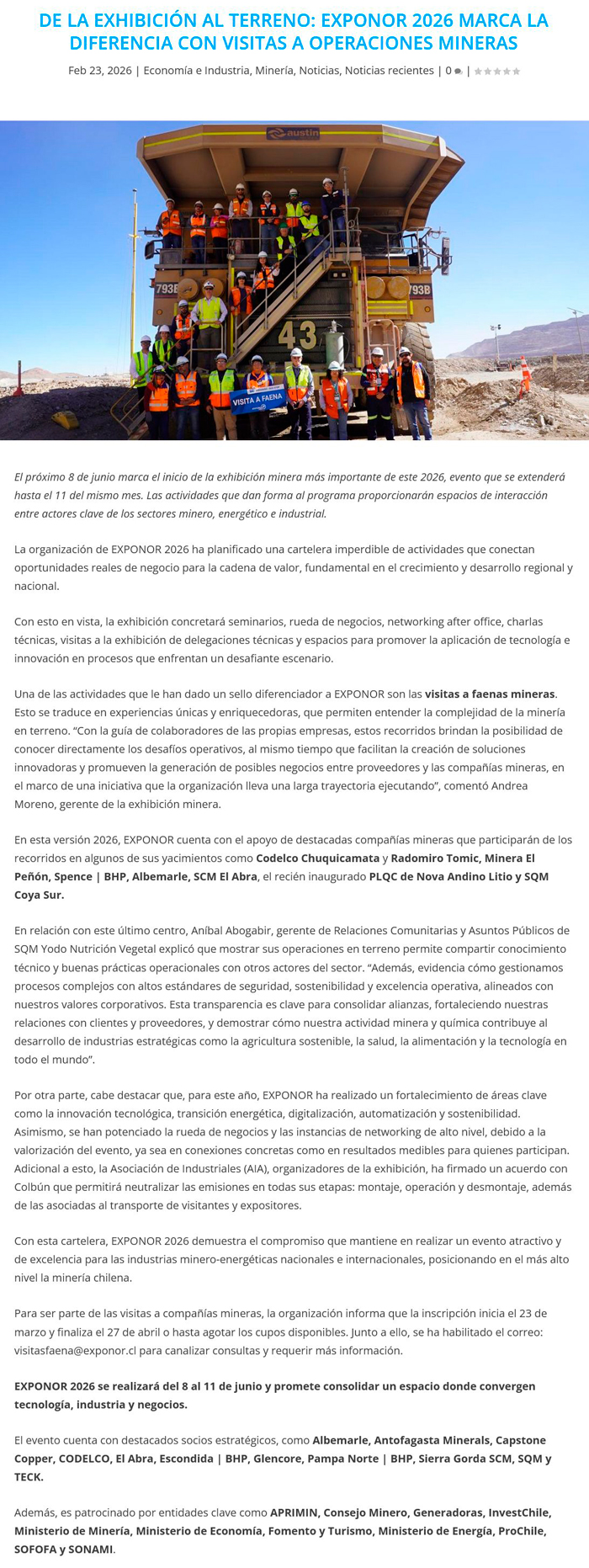 De la exhibición al terreno: EXPONOR 2026 marca la diferencia con visitas a operaciones mineras - (madero.cl)