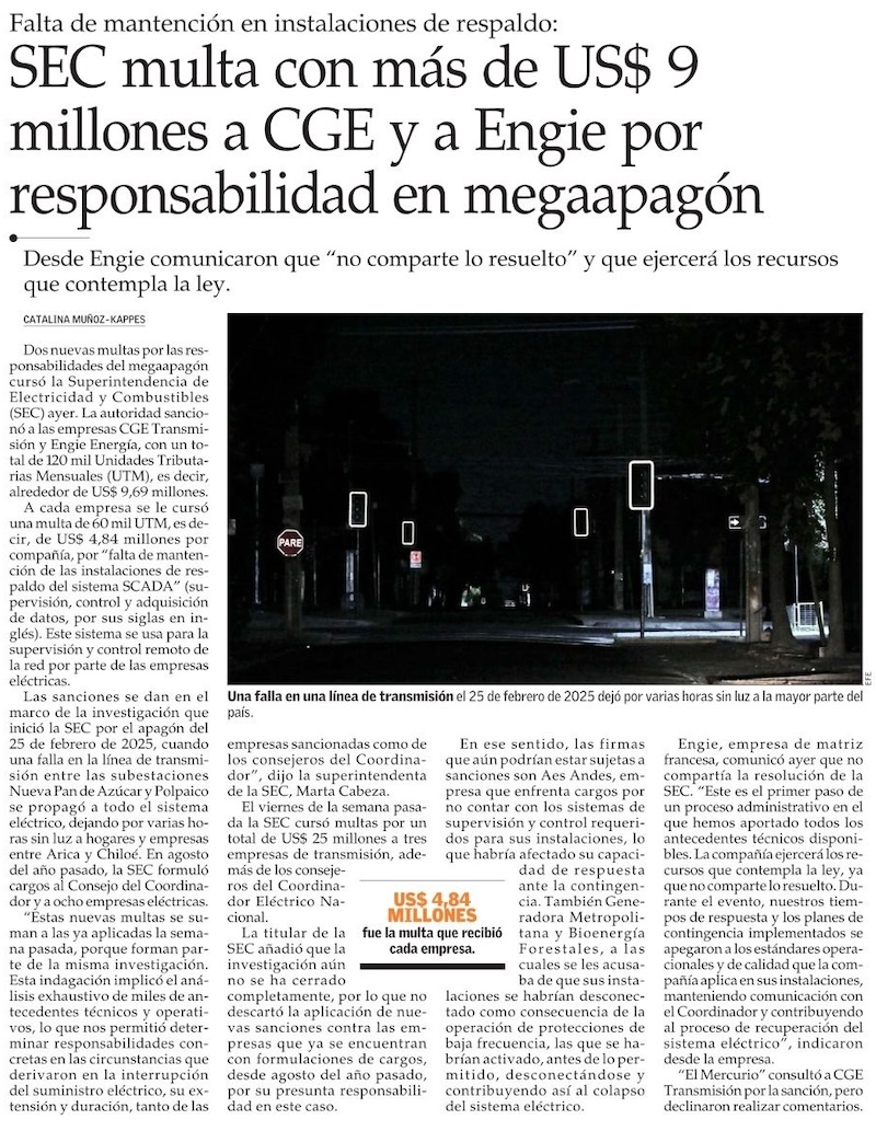 SEC sanciona a CGE y Engie por apagón de febrero de 2025 y ya son cinco las empresas multadas - (Diario Financiero)