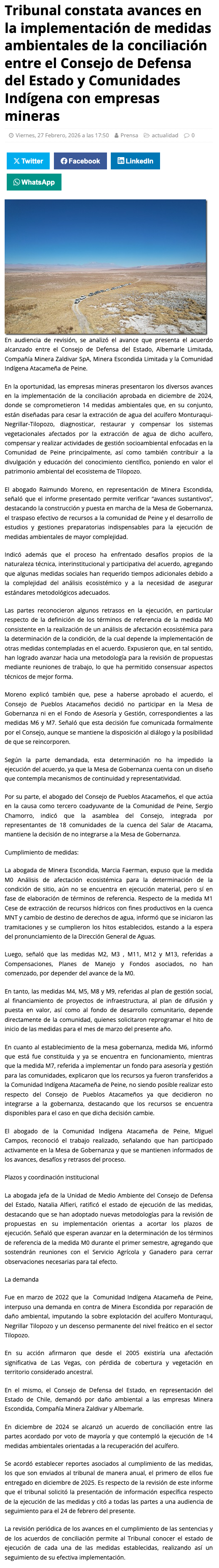 Tribunal constata avances en implementación de medidas ambientales de conciliación entre el CDE y comunidad indígena con mineras - (mch.cl)