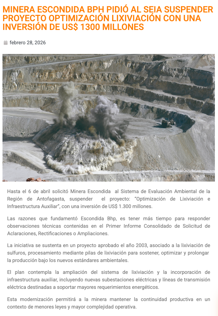 Minera Escondida | BHP pausa hasta abril proyecto de US$1.300 millones en el SEIA - (redimin)