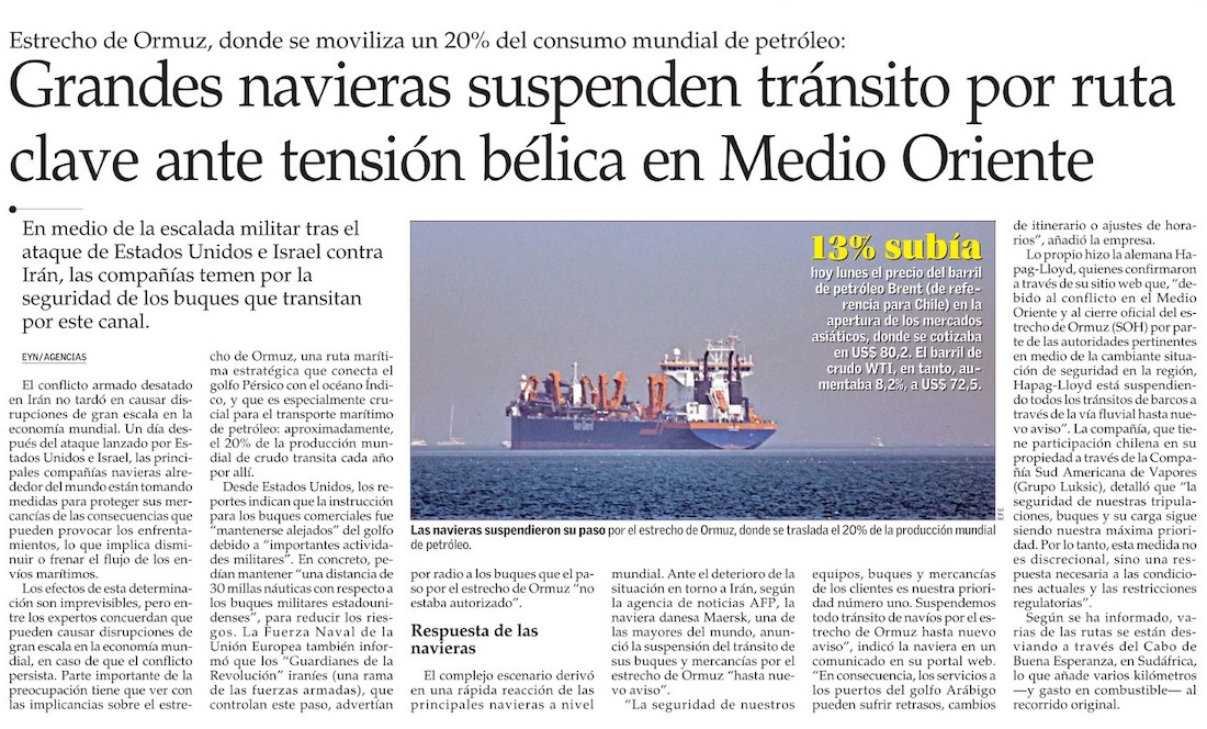 Escalada de conflicto bélico en Medio Oriente afecta a negocio de transporte marítimo y elevará precio del petróleo - (Diario Financiero)