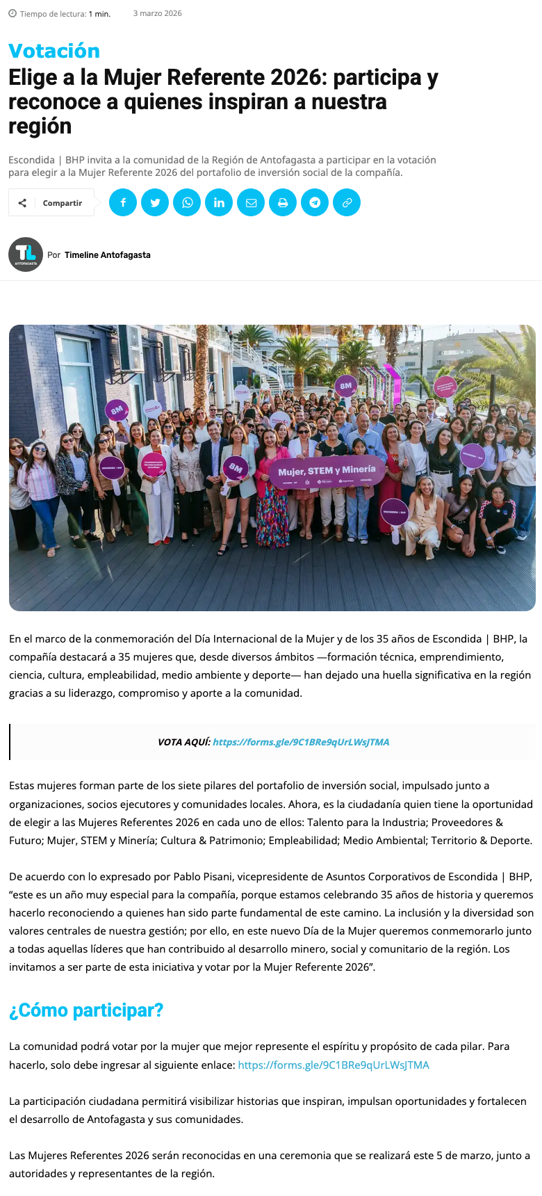 Escondida | BHP invita a elegir a la Mujer Referente 2026: Participa y reconoce a quienes inspiran a nuestra región - (regionalista.cl)