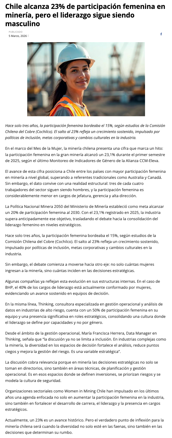 Participación femenina en la minería chilena alcanza 23%, pero persiste brecha en cargos de liderazgo - (mineriayfuturo.cl)