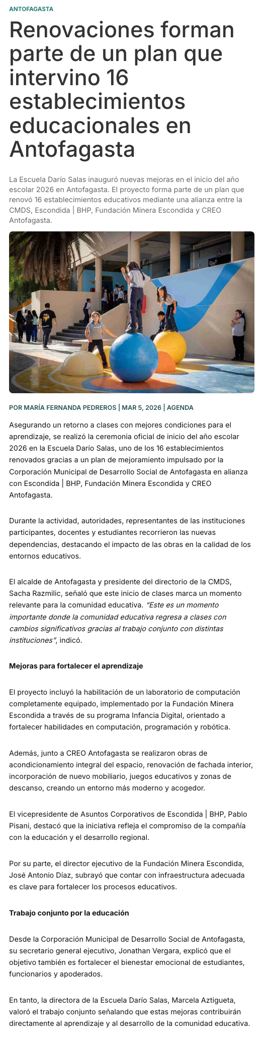 CMDS inaugura el año escolar en Antofagasta con 16 establecimientos renovados - (diarioangamos)
