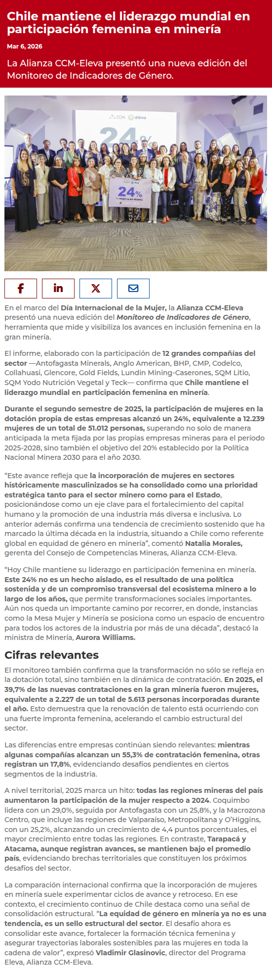 Chile sigue con medalla de oro en participación de mujeres en minería: llega al 24% - (soyantofagasta)