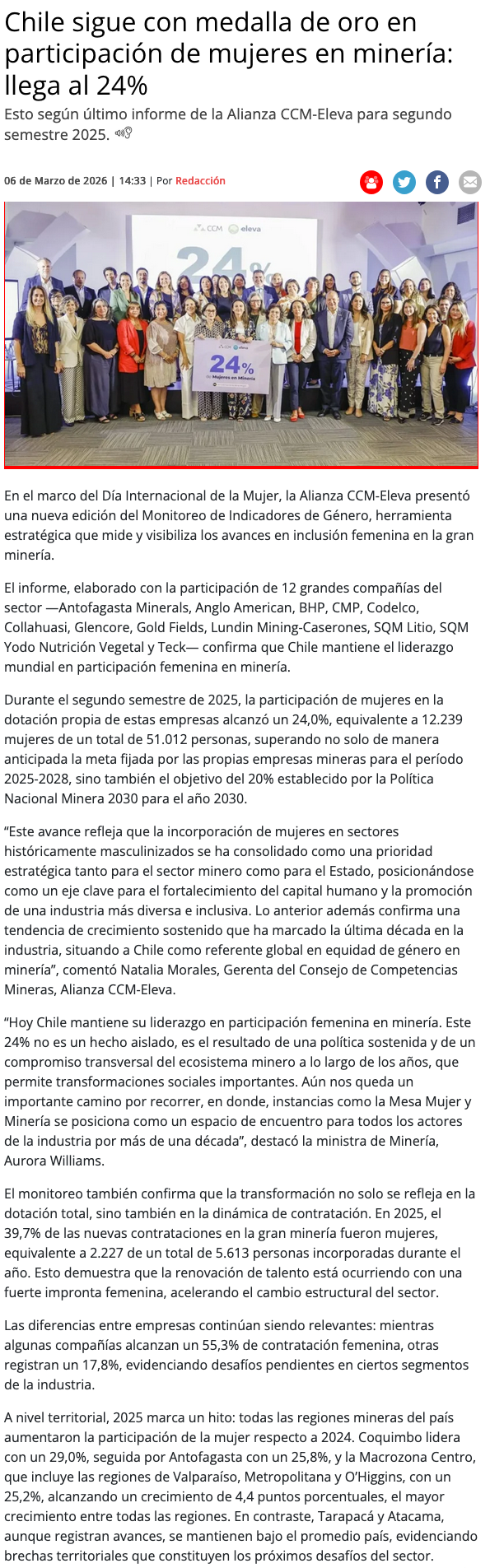 Chile mantiene el liderazgo mundial en participación femenina en minería - (mch.cl)