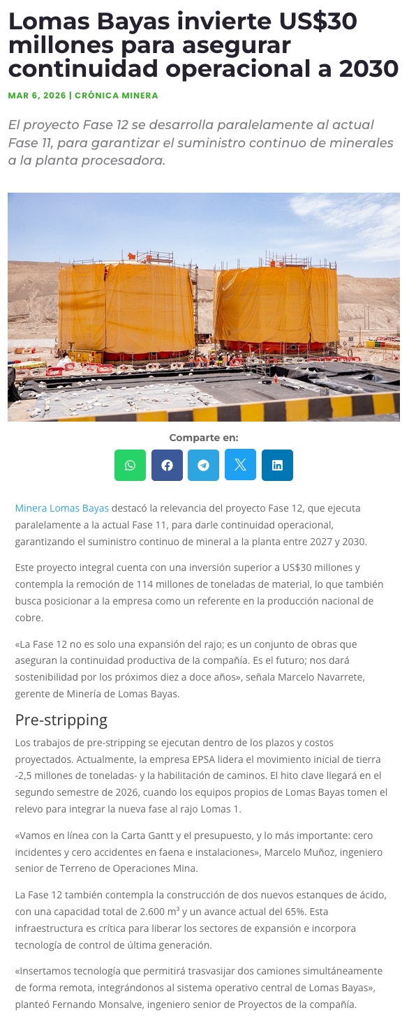 Fase 12 de minera Lomas Bayas asegura su continuidad operacional hasta 2030 - (El Mercurio de Antofagasta)